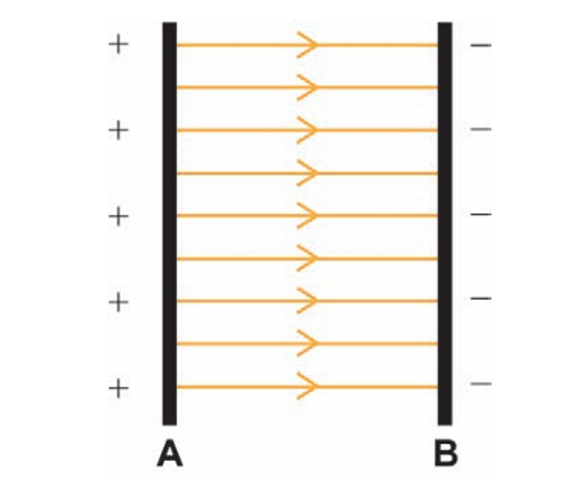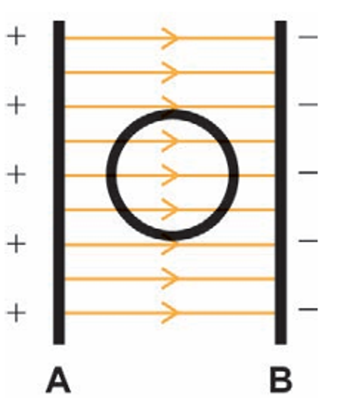 Em um experimento de laboratório, duas barras metálicas, A e B, são carregadas com cargas opostas e imersas em óleo. Farelo de milho é jogado sobre o óleo e, após um certo tempo, o farelo assume o formato das linhas de campo elétrico entre as barras. A figura representa a vista superior desse experimento.