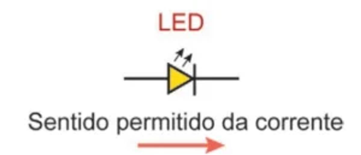 tensão e uma corrente máxima de funcionamento, Um LED acende apenas se a corrente que o percorre está no sentido permitido e se a diferença de potencial à qual está submetido é igual ou superior à sua tensão de funcionamento. A figura ilustra o símbolo do LED usado na representação de circuitos.