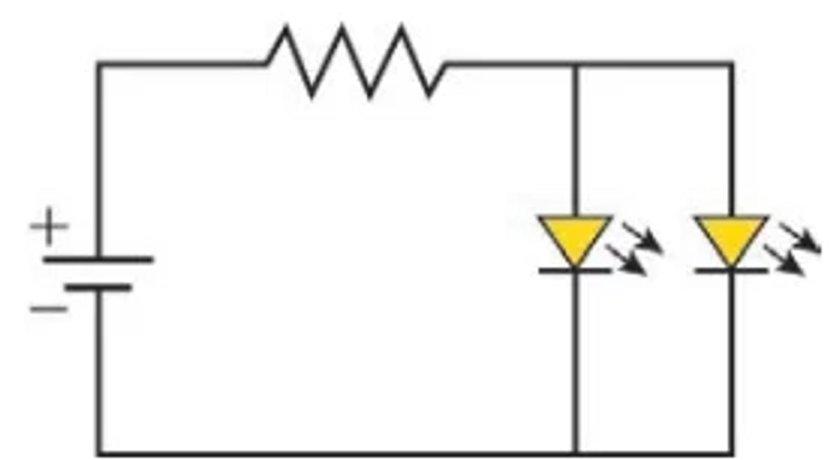 O circuito que o estudante pode montar, para que ambos os LEDs fiquem acesos e cada um seja percorrido por , é
