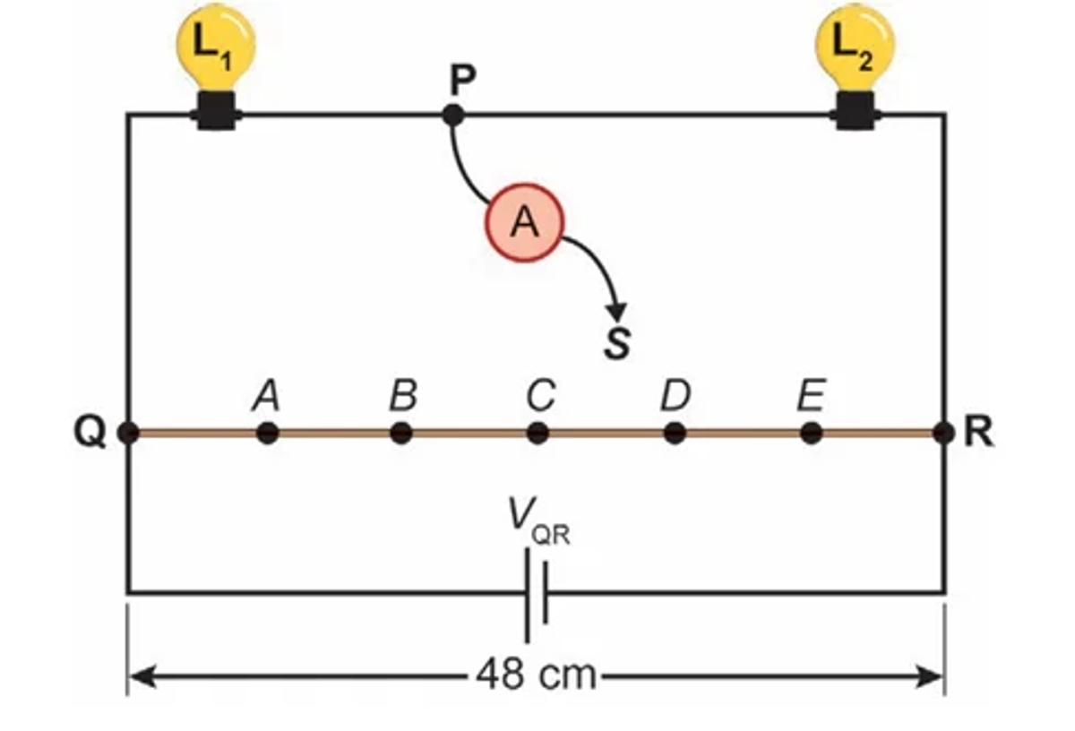 Uma caixa decorativa utiliza duas pequenas lâmpadas, (6 V – 9 W) e (12 V – 18 W), ligadas em série a uma bateria de tensão VQR. Um fio resistivo QR, de 48 centímetros, está ligado em paralelo à bateria. Cinco pontos, A, B, C, D e E, dividem o fio QR em seis segmentos de comprimentos iguais. O circuito também tem um amperímetro com dois terminais. Um dos terminais (P) está ligado ao fio entre as duas lâmpadas. O outro terminal (S) está livre e será ligado ao fio QR. Dependendo do ponto em que esse terminal livre for conectado, ocorrerá a mudança na tensão à qual as lâmpadas são submetidas. Os demais fios do circuito têm resistências elétricas desprezíveis. A figura ilustra esse circuito