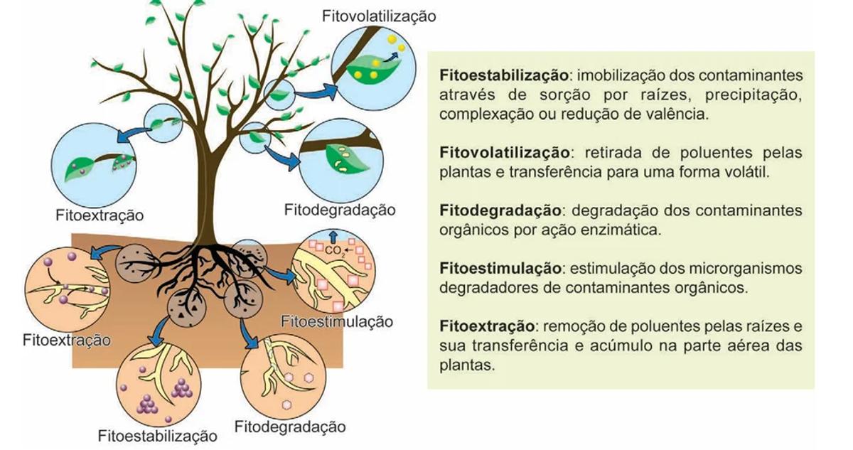 A fitorremediação é uma técnica que utiliza plantas para a remediação de ambientes contaminados. A descontaminação de solos pode ocorrer por descarte, absorção e metabolização, imobilização, extração ou volatilização do poluente, conforme representado na figura.