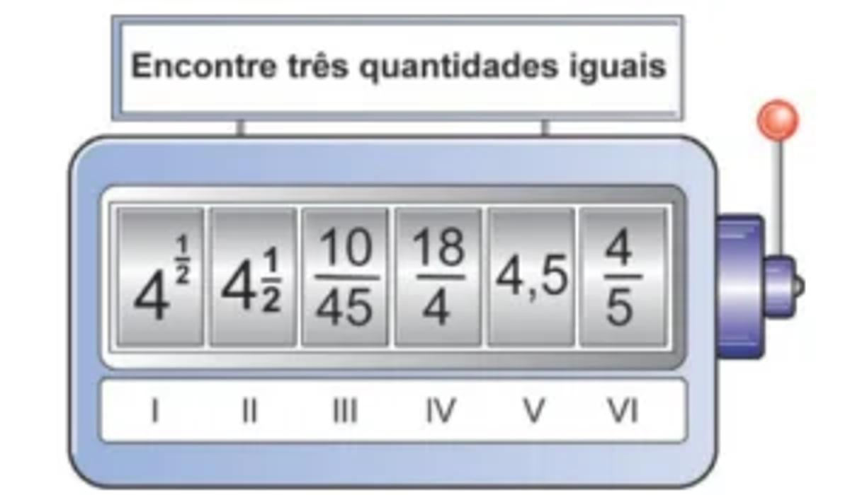 Uma professora de matemática utiliza em suas aulas uma “máquina caça-números” para verificar os conhecimentos de seus estudantes sobre representações de números racionais. Essa máquina tem um visor dividido em seis compartimentos e, na lateral, uma alavanca. Cada estudante puxa a alavanca e espera que os compartimentos parem de girar. A partir daí, precisa responder para a professora em quais posições se encontram os números que representam a mesma quantidade.