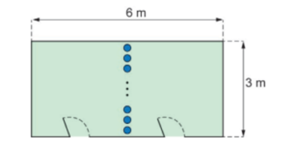 Uma sala com piso no formato retangular, com lados de medidas 3 m e 6 m, será dividida em dois ambientes. Para isso, serão utilizadas colunas em formato cilíndrico, dispostas perpendicularmente ao piso e representadas na figura pelos círculos de cor azul. Os centros desses círculos estarão sobre uma reta paralela aos lados de menor medida do piso da sala. Os vãos entre duas colunas e entre uma coluna e a parede não poderão ser superiores a 15 cm.