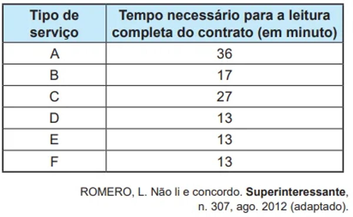 O tempo médio, em minuto, necessário para a leitura completa de um contrato de serviço dentre os listados no quadro é, com uma casa decimal, aproximadamente,