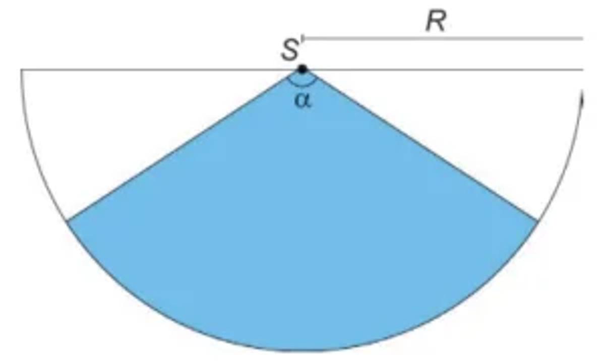 Um proprietário pretende instalar um sensor de presença para a proteção de seu imóvel. O sensor deverá detectar movimentos de objetos e pessoas numa determinada região plana. A figura ilustra a vista superior da área de cobertura (setor circular em azul) de um sensor colocado no ponto S. Essa área depende da medida do ângulo α, em grau, e do raio R, em metro.