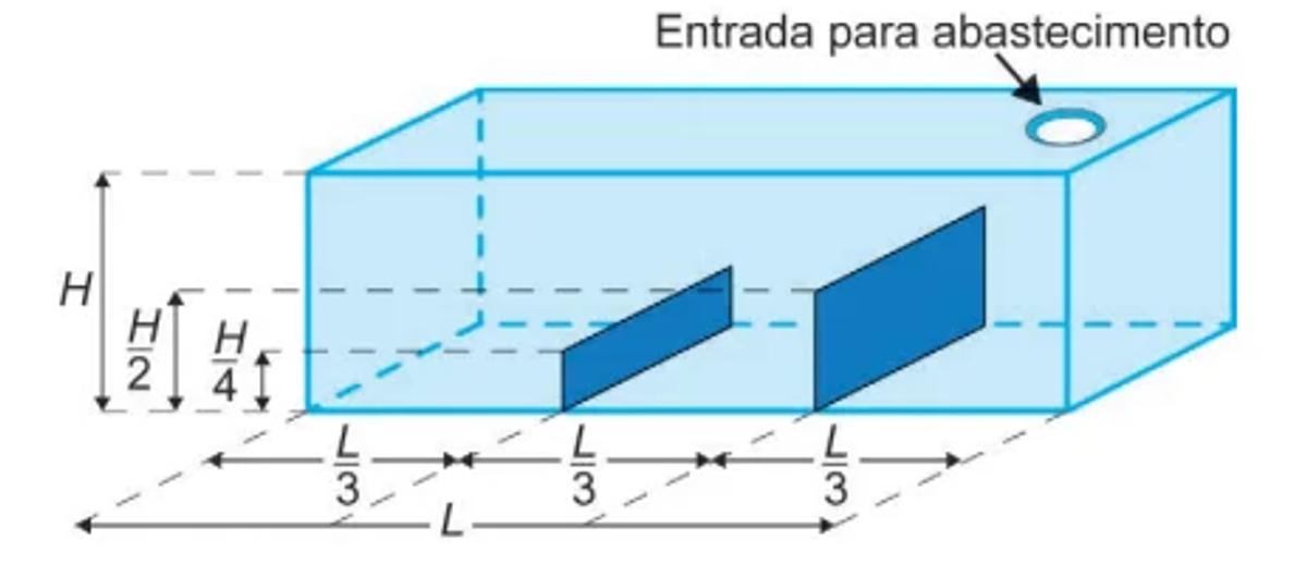Esses anteparos, de espessuras desprezíveis, estão instalados de maneira a dividir a base do tanque em três retângulos congruentes, tendo suas alturas iguais à metade e a um quarto da altura do tanque. O tanque é abastecido por uma entrada situada no teto, através de um duto que despeja água a uma vazão constante, sendo necessárias 12 horas para finalizar o seu enchimento.