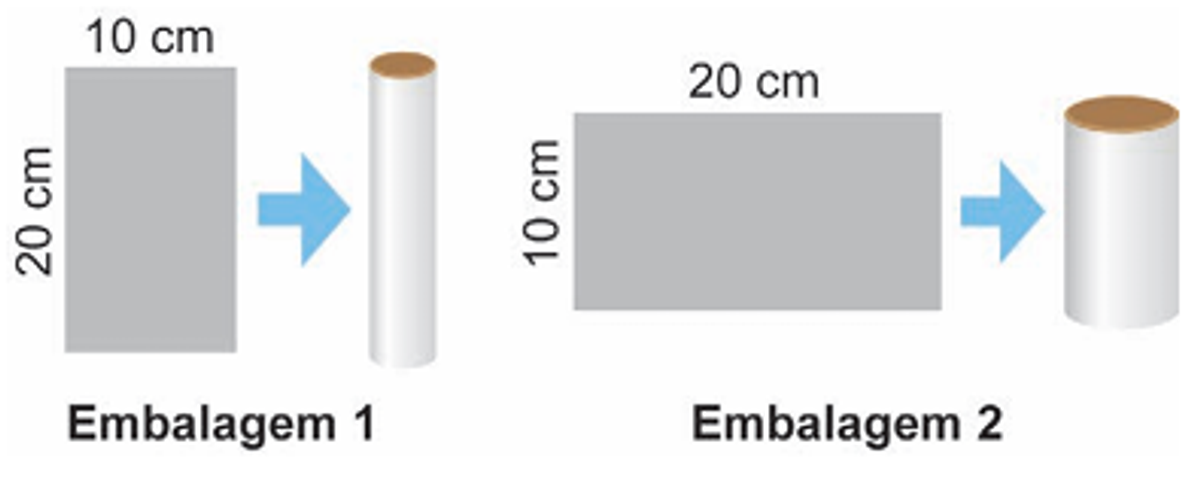 Uma indústria faz uma parceria com uma distribuidora de sucos para lançar no mercado dois tipos de embalagens. Para a fabricação dessas embalagens, a indústria dispõe de folhas de alumínio retangulares, de dimensões 10 cm por 20 cm. Cada uma dessas folhas é utilizada para formar a superfície lateral da embalagem, em formato de cilindro circular reto, que posteriormente recebe fundo e tampa circulares. A figura ilustra, dependendo de qual das duas extensões será utilizada como altura, as duas opções para formar a possível embalagem.