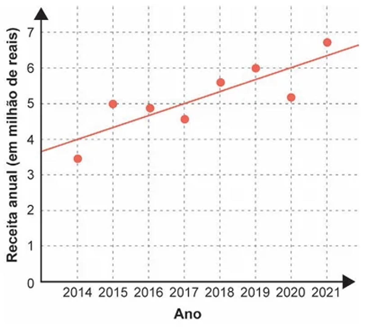 As receitas anuais obtidas por uma indústria no período de 2014 a 2021, em milhão de reais, foram registradas, por pontos, em um gráfico. Nele, também está representada a reta que descreve a tendência de evolução das receitas. Essa reta pode ser utilizada para estimar as receitas dos anos seguintes.