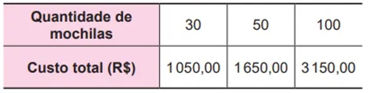 Uma empresa produz mochilas escolares sob encomenda. Essa empresa tem um custo total de produção, composto por um custo fixo, que não depende do número de mochilas, mais um custo variável, que é proporcional ao número de mochilas produzidas. O custo total cresce de forma linear, e a tabela apresenta esse custo para três quantidades de mochilas produzidas.