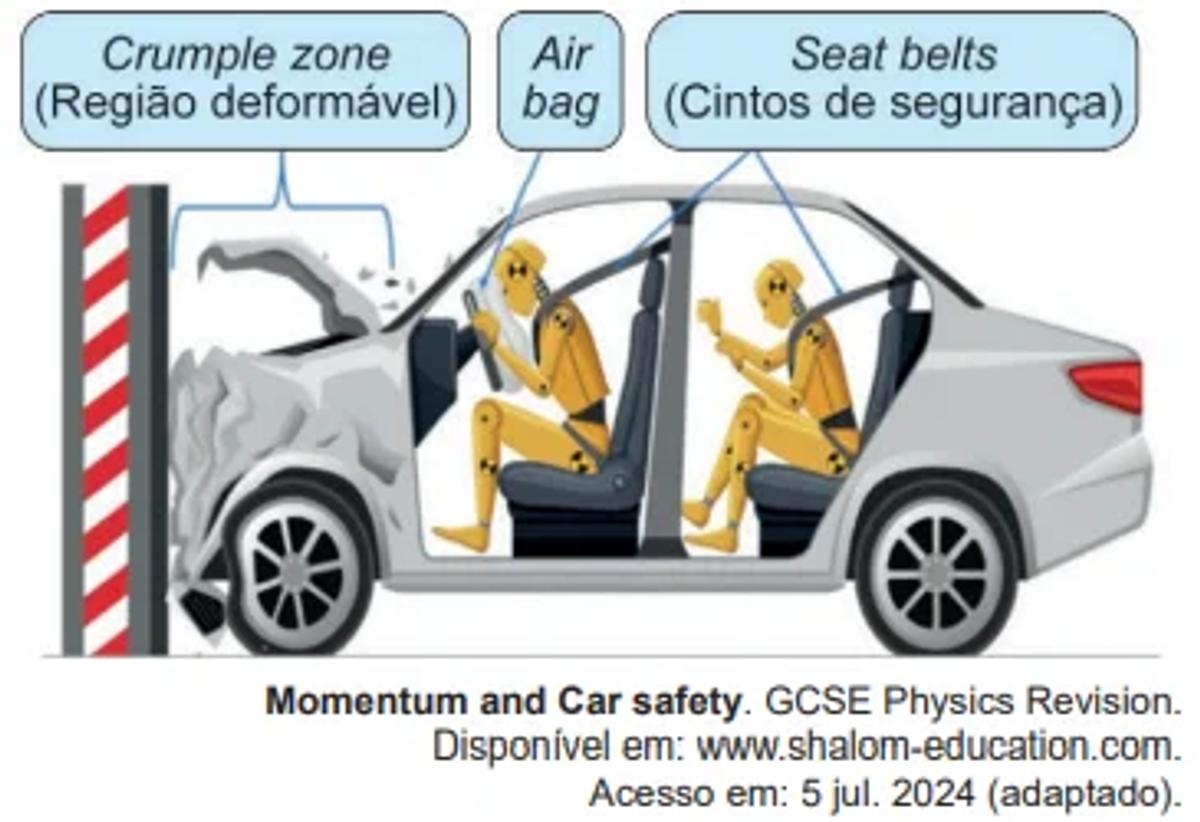 Considerando o carro, seus ocupantes e o muro da figura como um sistema isolado, o crumple zone aumenta a segurança dos passageiros porque, durante uma colisão, a deformação da estrutura do carro