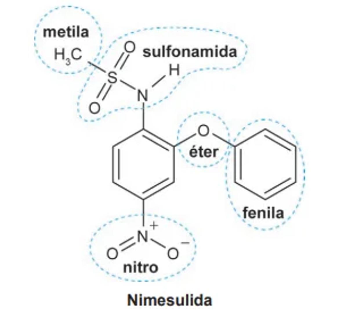 A nimesulida é um fármaco pouco solúvel em água, utilizado como anti-inflamatório, analgésico e antitérmico. Essa substância pode ser convertida em uma espécie eletricamente carregada, de maior solubilidade em água, mediante o tratamento com uma base de Brönsted-Lowry, isto é, uma espécie química capaz de capturar um próton (H+). Na figura são apresentados os grupamentos presentes na estrutura química da nimesulida.