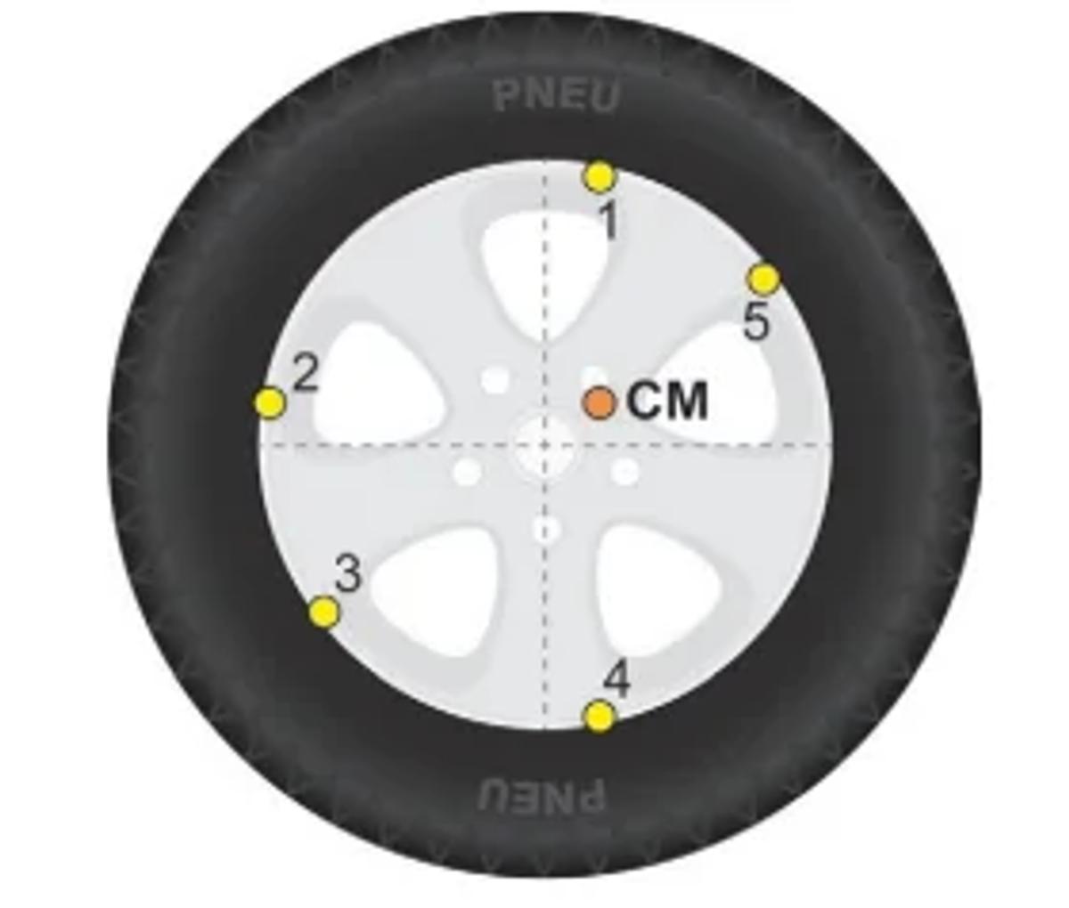 Nos automóveis, é importante garantir que o centro de massa (CM) de cada conjunto roda/pneu coincida com o seu centro geométrico. Esse processo é realizado em uma máquina de balanceamento, na qual o conjunto roda e pneu é colocado para girar a uma velocidade de valor constante. Com base nas oscilações medidas, a máquina indica a posição do centro de massa do conjunto, e pequenas peças de chumbo são fixadas em lugares específicos da roda até que as vibrações diminuam. Durante o treinamento de sua equipe, a fim de corrigir a posição do centro de massa indicada pela máquina, um mecânico apresenta o esquema a seguir, com cinco possíveis pontos da roda para posicionar uma peça de chumbo.