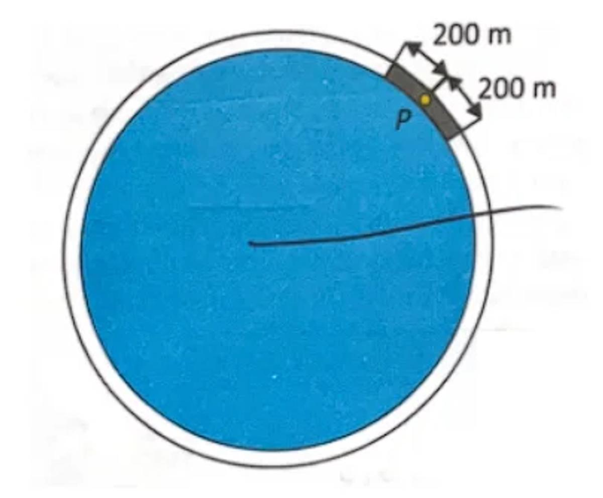 No entorno de uma lagoa circular, cujo raio mede 1 km, há uma ciclovia. Devido aos frequentes roubos de bicicleta, a prefeitura planeja alocar policiais em posições estratégicas para patrulhar essa ciclovia, de forma a torná-la totalmente protegida. Um ponto da ciclovia é considerado protegido se houver pelo menos um policial a, no máximo, 200 m de distância daquele ponto, posicionado sobre a ciclovia. A figura ilustra um ponto P sobre a ciclovia, que estará protegido se houver pelo menos um policial posicionado sobre a região de cor cinza escuro.