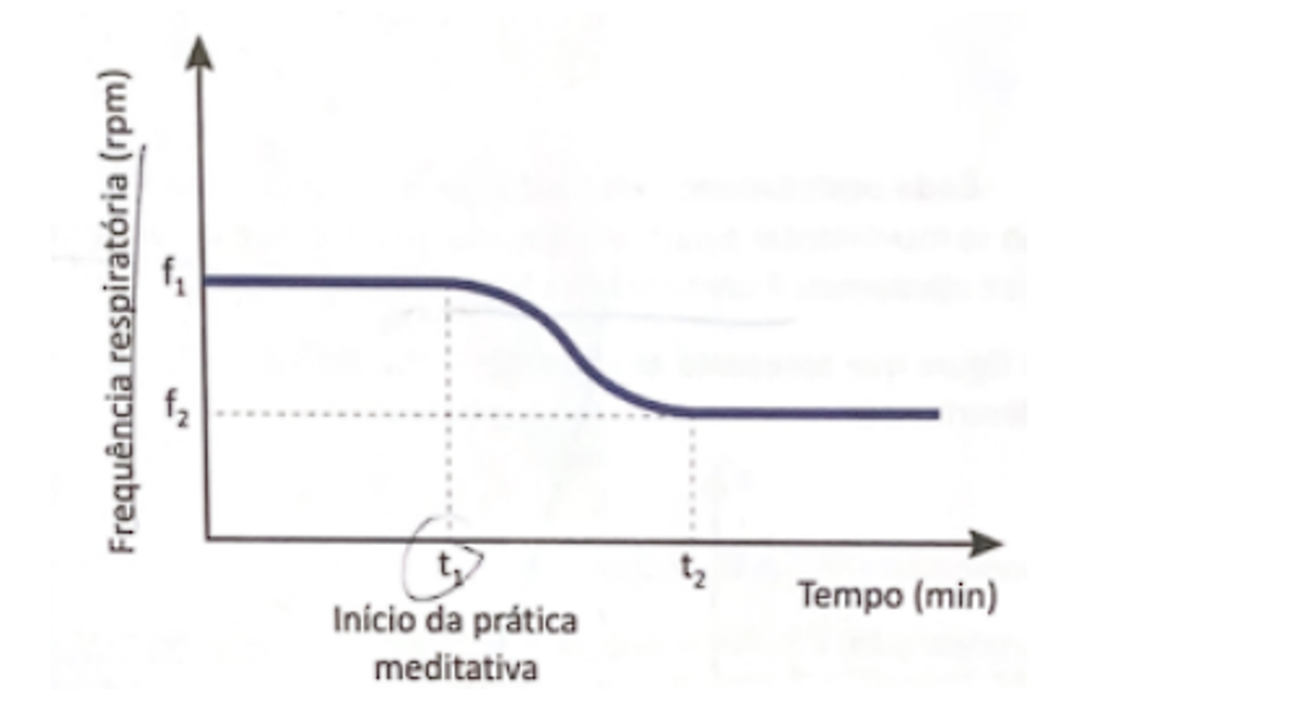 Pesquisas na área de neurobiologia confirmam que a prática meditativa é responsável por diminuir consideravelmente a frequência respiratória para praticantes avançados, que, após iniciarem a meditação, têm suas frequências respiratórias reduzidas até se estabilizarem em um nível mais baixo. O gráfico apresenta a relação da frequência respiratória, em incursões de respirações por minuto (rpm), em relação ao tempo, em minuto, de um praticante avançado, em que (f1) representa a frequência no instante t1, no qual se inicia a prática meditativa; e (f2), a frequência no instante t2, a partir do qual esta se estabiliza durante a meditação.