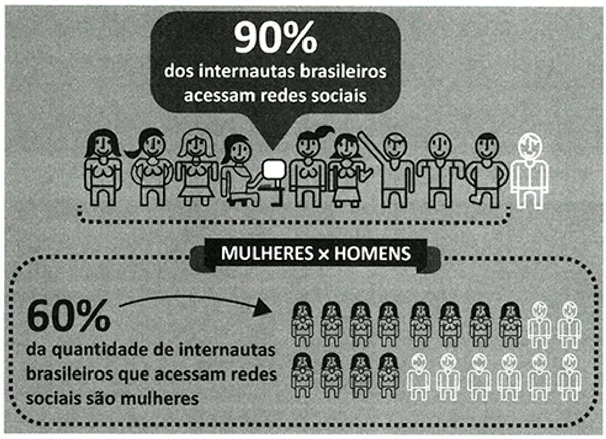 A reportagem de uma revista abordou o uso de redes sociais pelos internautas brasileiros. Alguns dos dados apurados pela reportagem estão apresentados no infográfico.