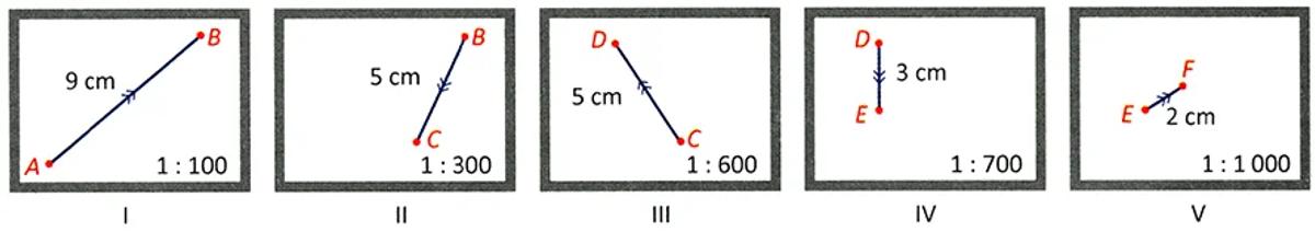 O controle remoto de um carrinho de brinquedo vem equipado com uma tela que ajusta automaticamente a escala empregada na exibição de cada deslocamento. A tela apresenta a imagem do deslocamento, a escala utilizada na geração dessa imagem e o comprimento desse deslocamento, em centímetro, em conformidade com a escala empregada. As figuras representam a tela do controle remoto exibindo os dados de cinco deslocamentos realizados por esse carrinho.