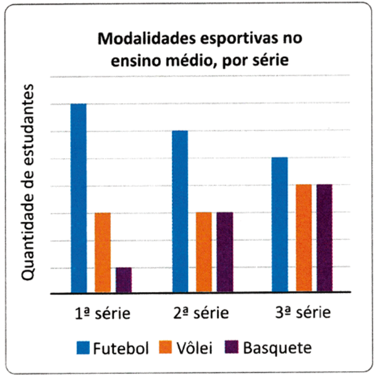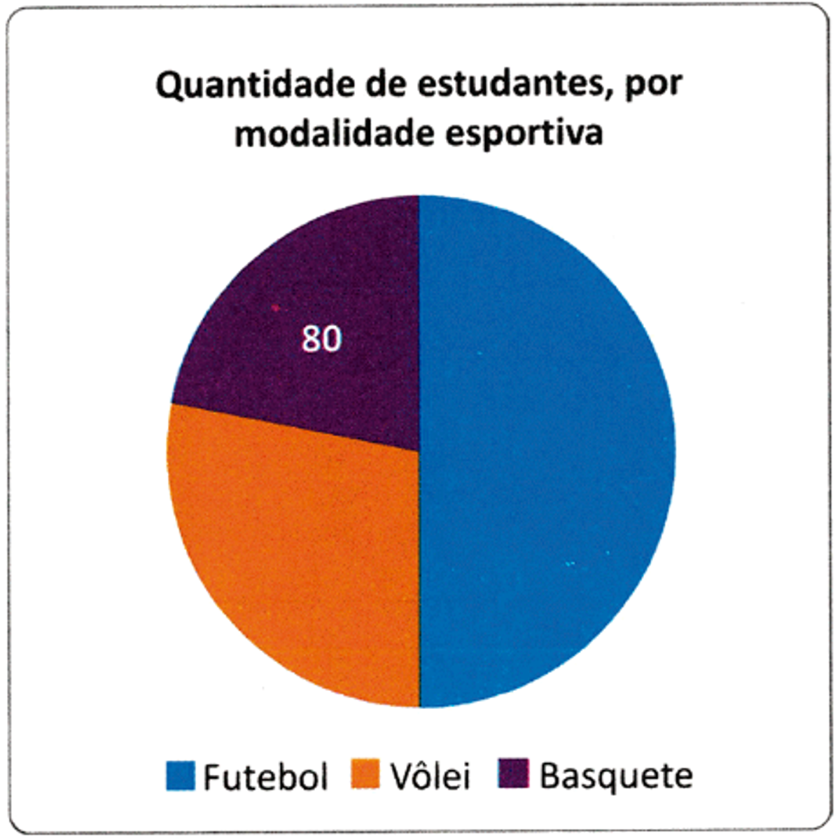 Em uma escola, todos os estudantes do ensino médio praticam uma das três modalidades esportivas oferecidas como atividade física, e cada um deles pratica somente uma dessas atividades. Os gráficos trazem alguns dados relativos aos quantitativos de estudantes que praticam essas modalidades esportivas nessa escola, apesar de algumas quantidades não terem sido informadas.
