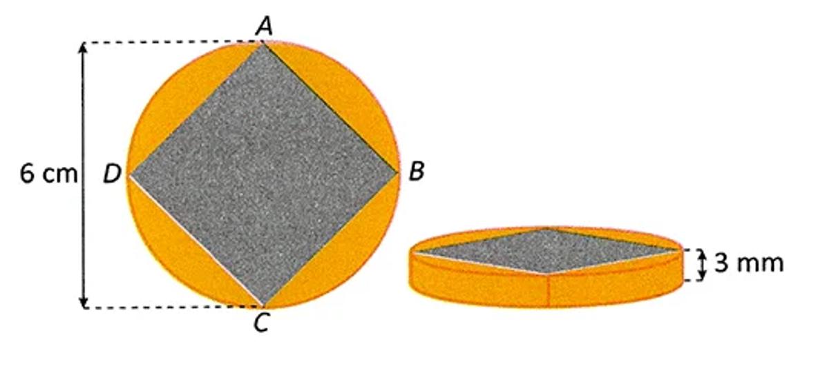 A figura ABCD tem a forma de um quadrado e é a base de um prisma que atravessa toda a medalha. A região da medalha externa a esse prisma será cunhada em ouro. Pretende-se cunhar 100 dessas medalhas.