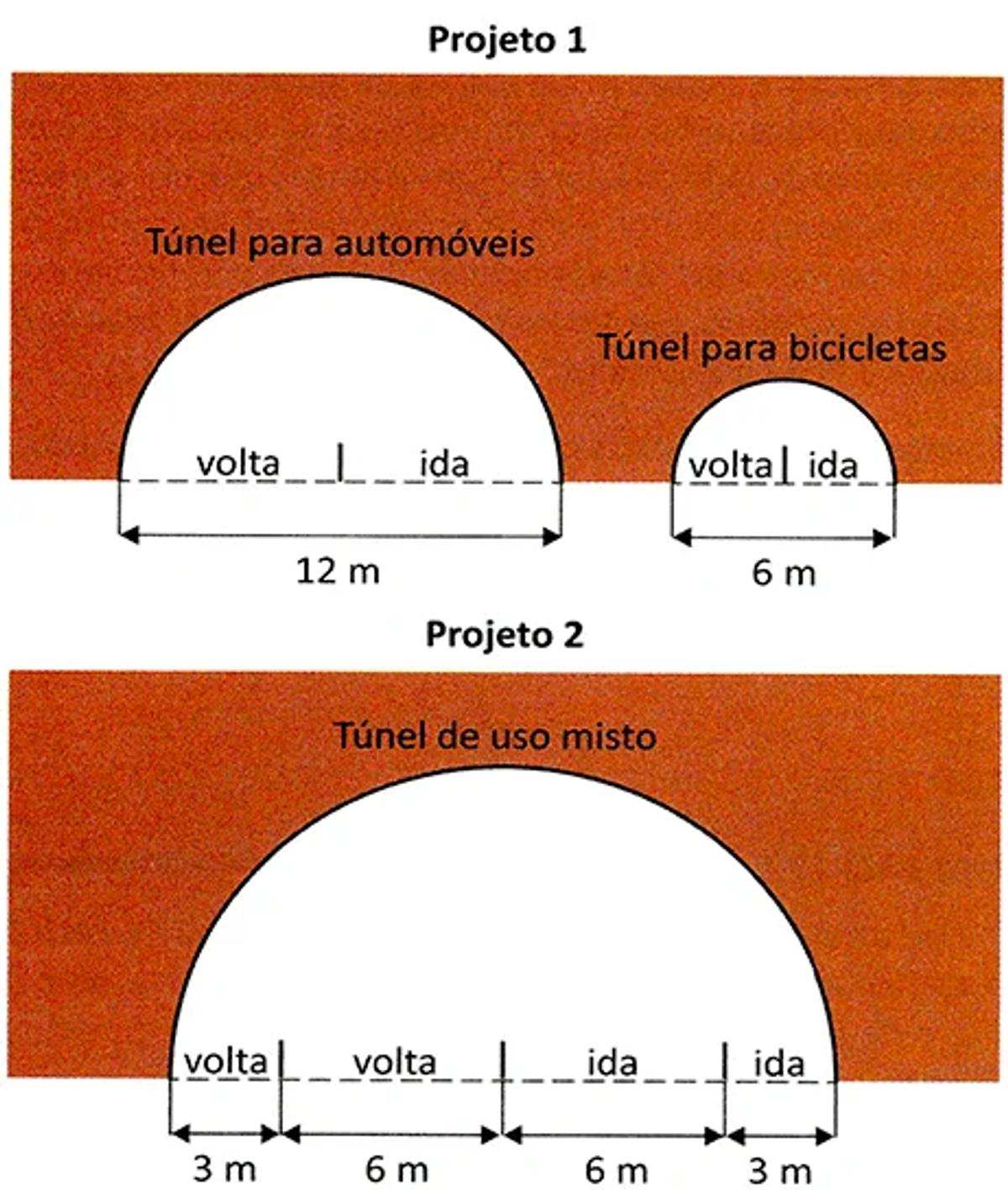 Em uma cidade, será construído um túnel que atravessa uma montanha para facilitar o trânsito de automóveis e bicicletas. Dois projetos foram elaborados e os esquemas com as vistas frontais desses projetos são apresentados na figura.